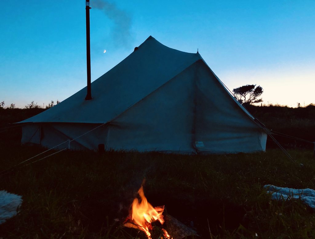 - 5m furnished bell tent with woodburning stove on levelled 6m x 6m pitch